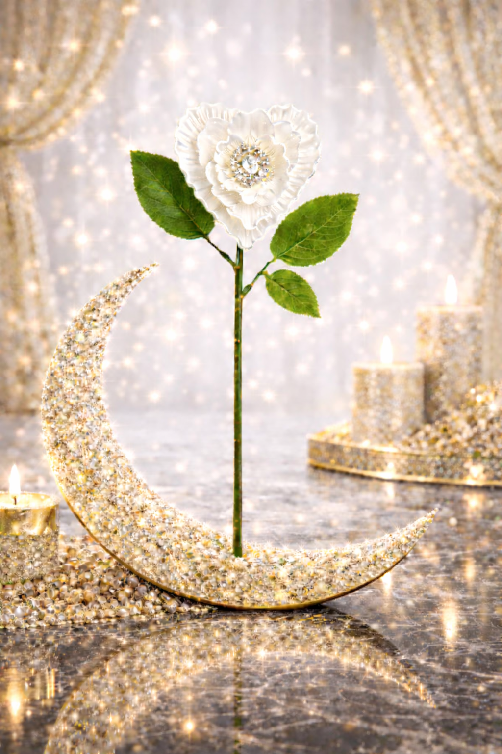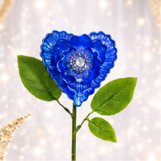 Cette fleur en forme de coeur, aux nuances ambre délicatement translucides, est sublimé par un éclat central subtilement scintillant, apportant une touche précieuse sans exès.