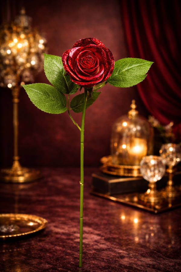 Chaque rose est façonnée avec une exigence absolue, puis délicatement rehaussée de paillettes, offrant une finition précieuse et maîtrisée