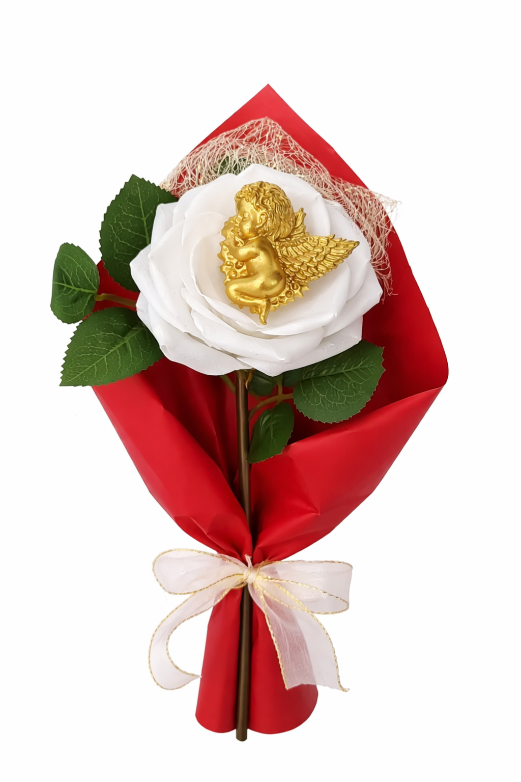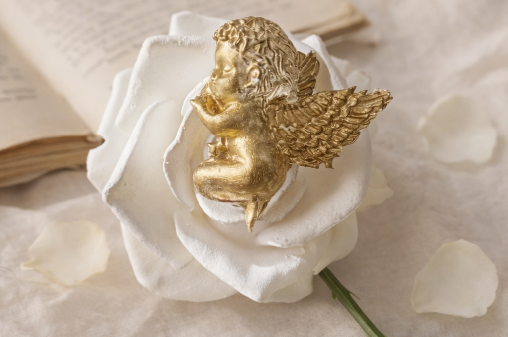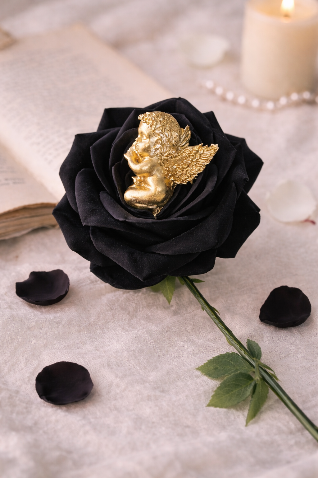 Les pétales soigneusement sculptés mettent en valeur la finesse du travail artisanal, tandis que l’ange doré apporte une touche céleste et lumineuse à l’ensemble.