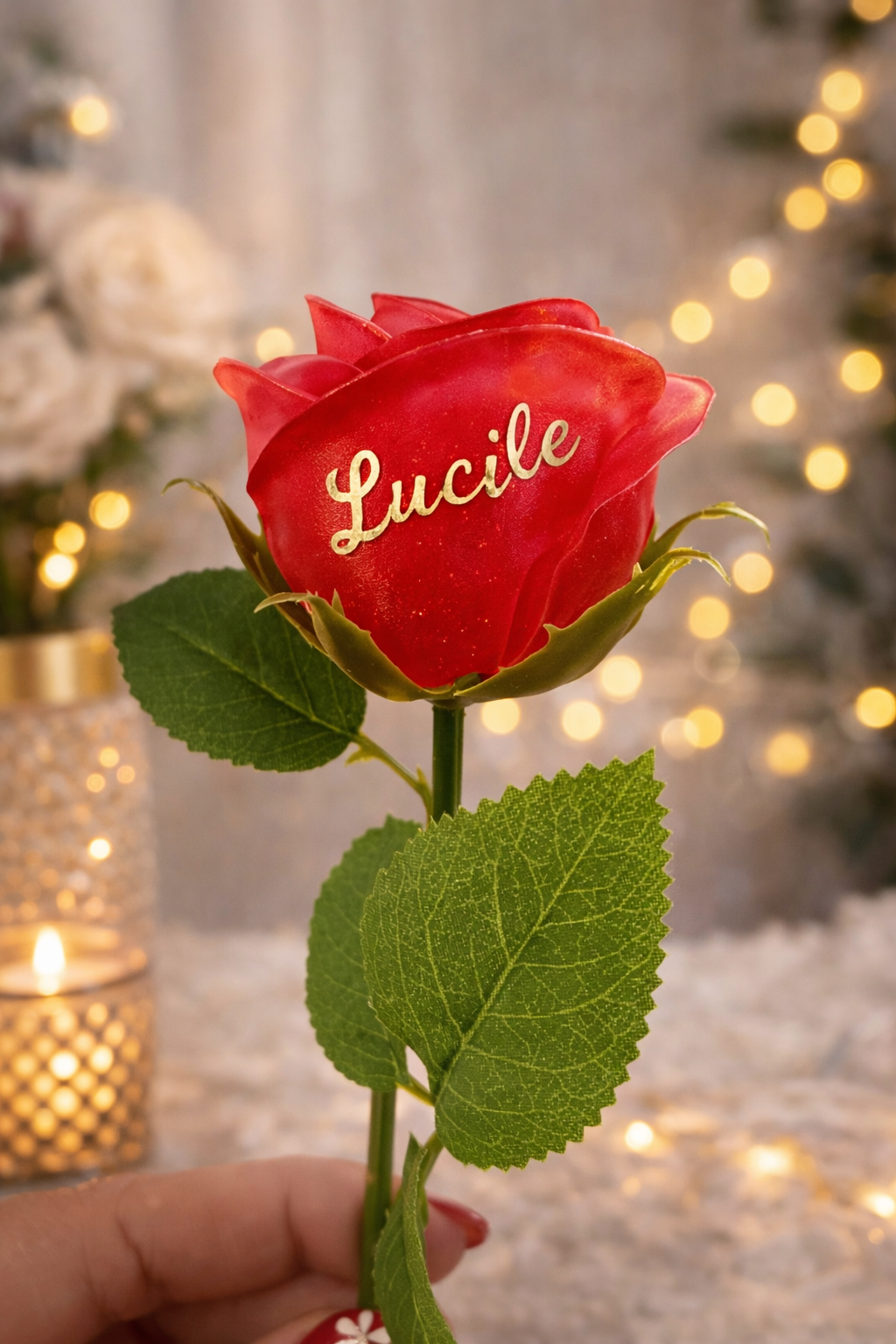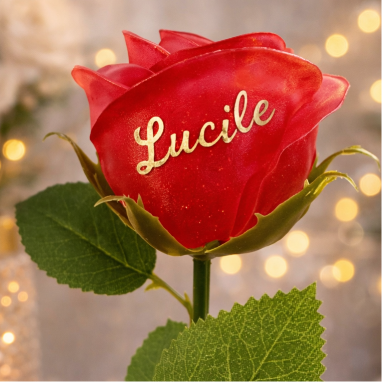 Chaque rose est personnalisée avec le prénom ou le mot de votre choix, ce qui en fait un cadeau original et profondément personnel.