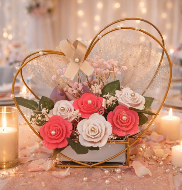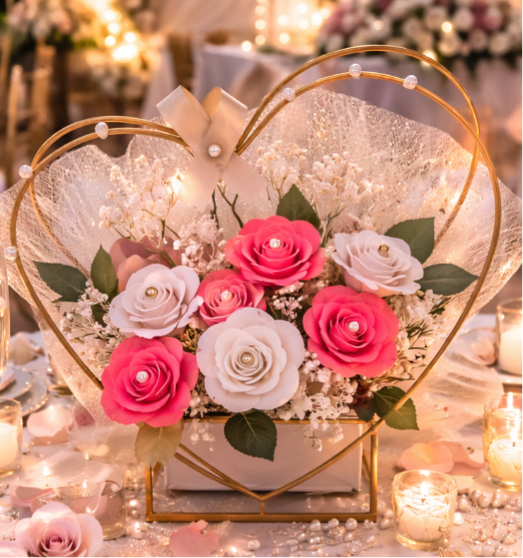 Présenté sur un support en métal doré en forme de cœur, ce bouquet allie charme, modernité et finesse. Chaque détail a été pensé pour créer une composition harmonieuse et raffinée, parfaite pour toutes les occasions.