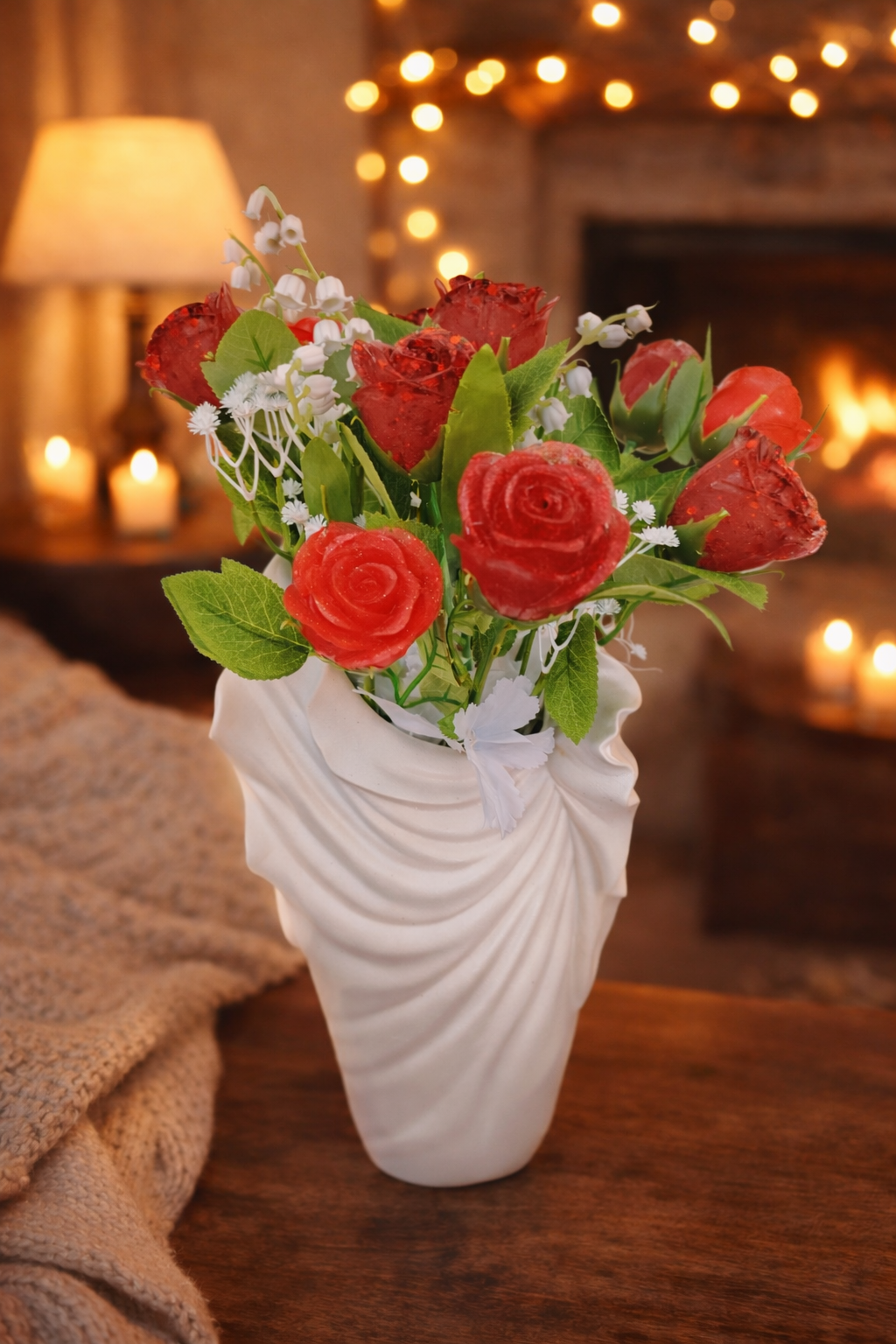 Présenté dans un élégant vase décoratif au design moderne, ce bouquet associe la beauté intemporelle des roses rouges à la douceur du muguet pour créer une ambiance chaleureuse et romantique.