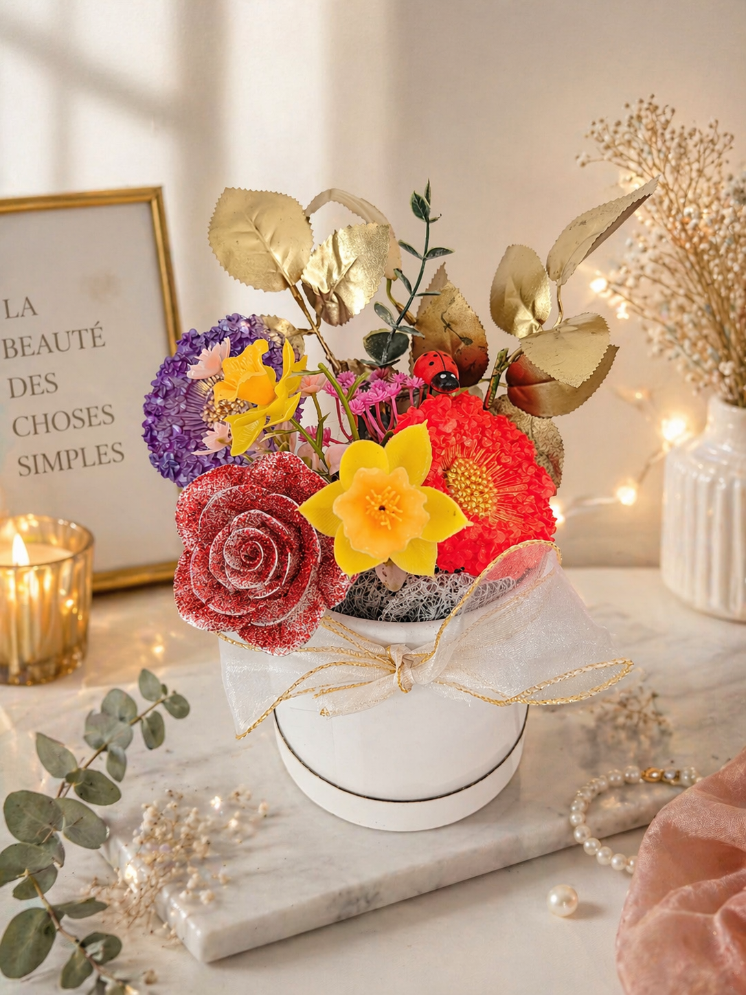 Apportez une touche de couleur et de raffinement à votre intérieur avec cette magnifique composition florale en résine et fleurs artificielles 💖